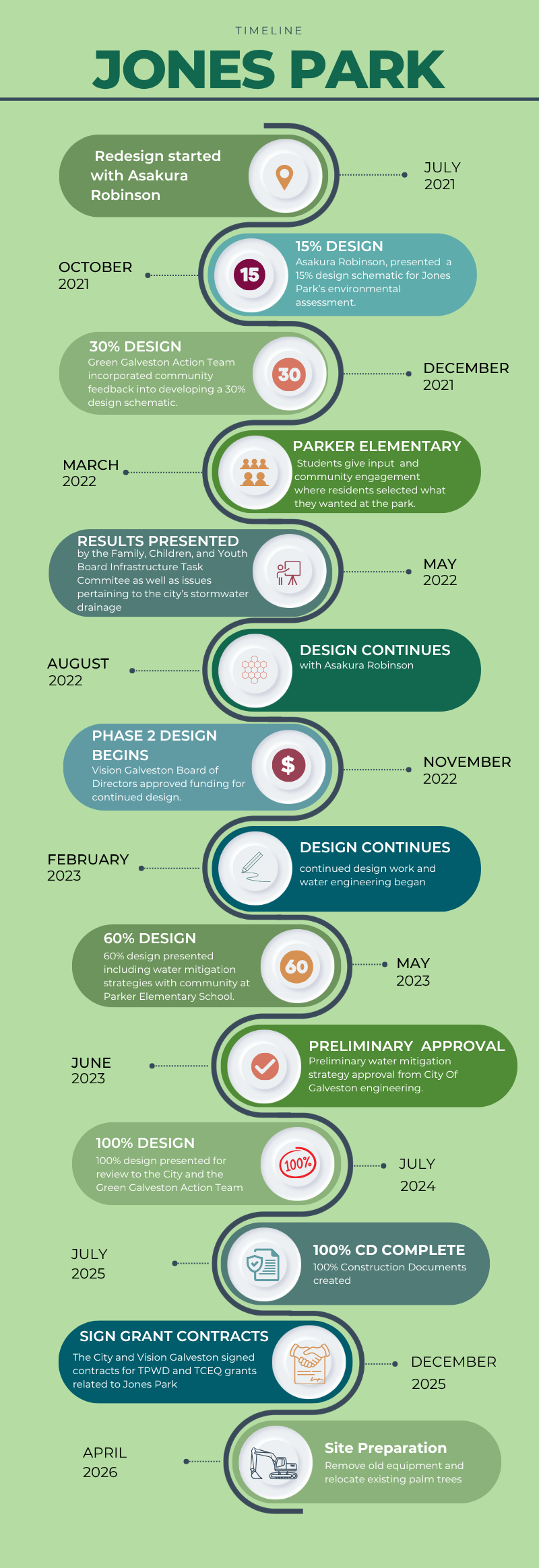 In November of 2022, The Vision Galveston Board of Directors approved the funding for the continued design for Phase 2 of the project. In February of 2023, design continued incorporating water engineering. In May of 2023 a 60% design schematic was presented to community members with Asakura Robinson, Better Parks for Galveston, The City of Galveston, Family, Children, and Youth Board Infrastructure Task Commitee and Vision Galveston at Parker Elementary School. Design included water mitigation. In June 2023, water mitigation strategy received a preliminary approval from City of Galveston Engineering. In July 2024, 100% Design was completed by Asakura Robinson and presented to the City of Galveston and the Green Galveston Action Team, and 100% Construction Documents are COMPLETE as of July 2025!